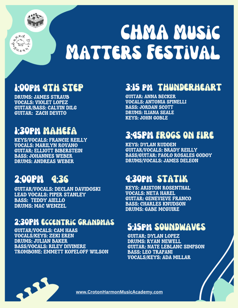 This SAT 6/22/24, our student rock bands will be taking over Baked By Susan‘s outdoor patio for our 2ND Annual Music Matters Rock Band Showcase!